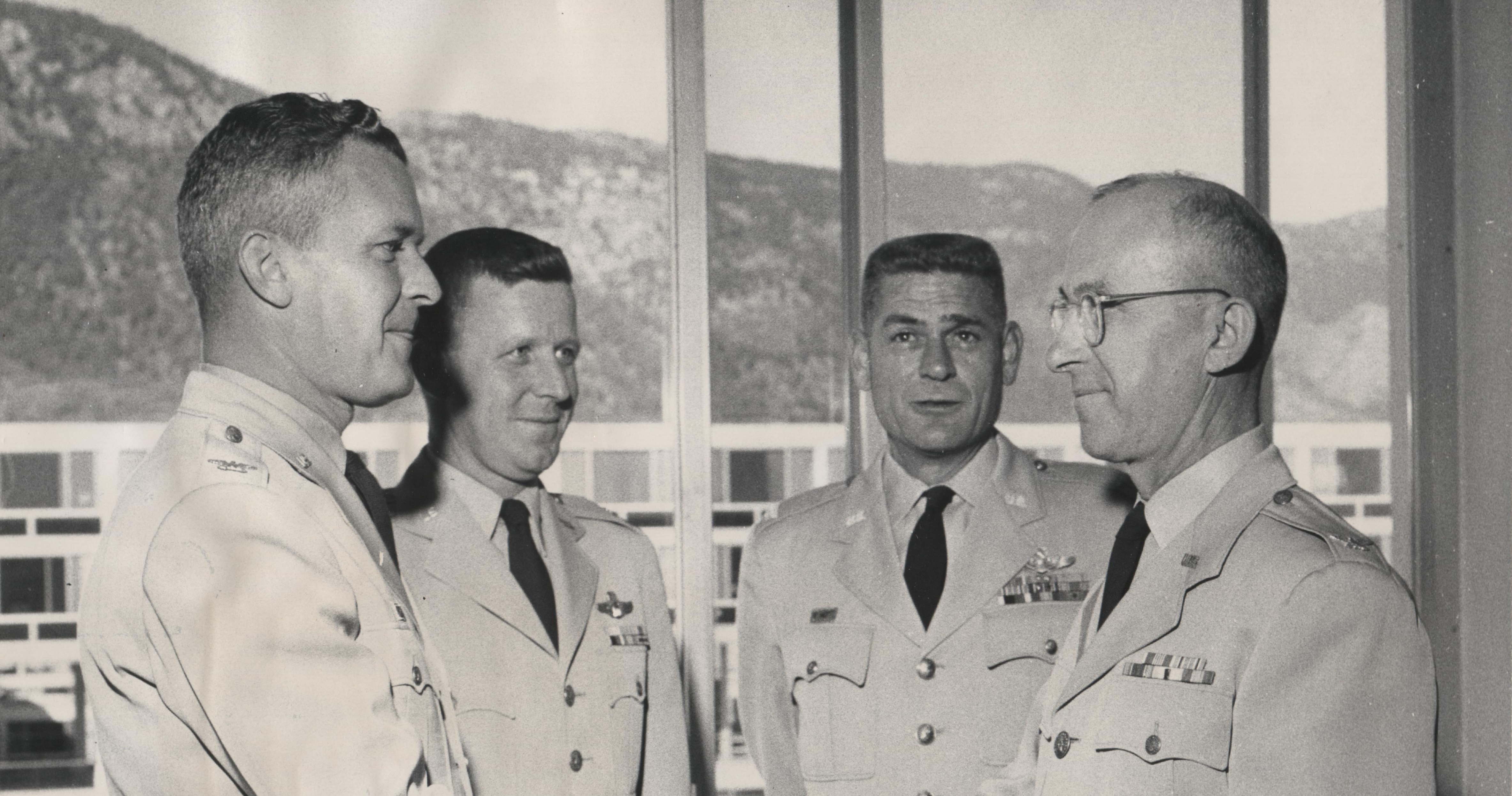 The next three Permanent Professors, Colonels Woodyard, Moody, and Higdon, were appointed in 1958. This photograph, from that year, shows these first four Permanent Professors (from left, Colonels McDermott, Woodyard, Moody, and Higdon). The scene is a familiar one, from the Dean’s office in Fairchild Hall overlooking the terrazzo to Harmon Hall and the Rampart Range beyond.