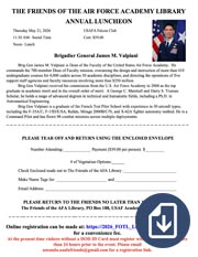 Join the Friends at the Air force Academy for our 38th Annual Luncheon on May 21 at 11:30 AM. Our guest speaker will be Brigadier General James M. Valpiana, Dean of Faculty, United States Air Force Academy.